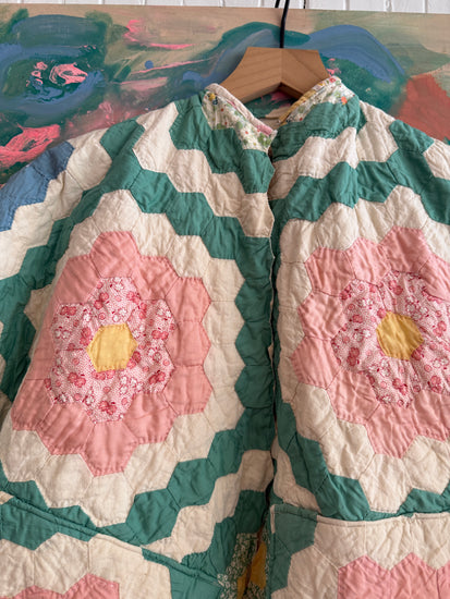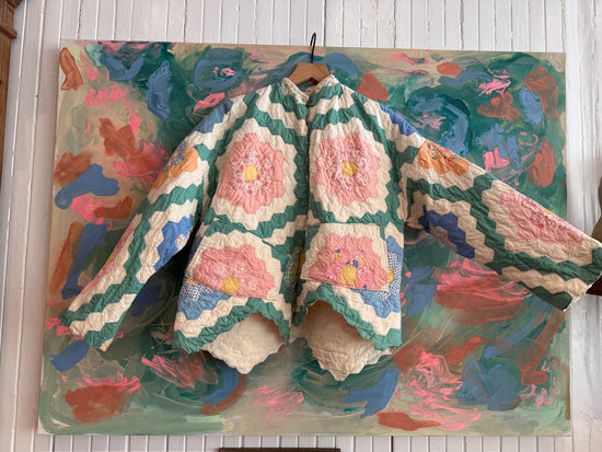 This is a one-of-a-kind handmade quilt jacket crafted from a repurposed from an antique cotton patchwork quilt with toned down colors cotton fabric. It has original scalloped edging on the front. Medium weight. This jackets fits a size medium/large. Two pockets at the front. No buttons.