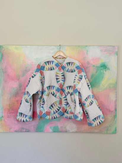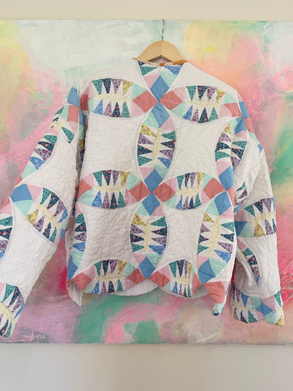 This is a one-of-a-kind handmade quilt jacket crafted from a repurposed cotton quilt with multicolor wedding ring design. Medium/heavy weight. This jackets fits a size medium/large (or oversize on size size small) Two pockets in the front . No buttons. The sleeves are mirrored.
