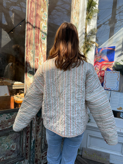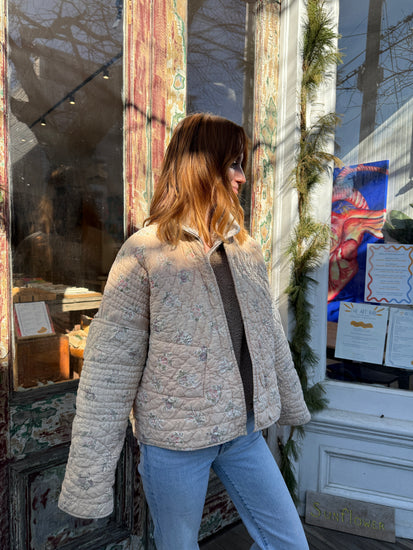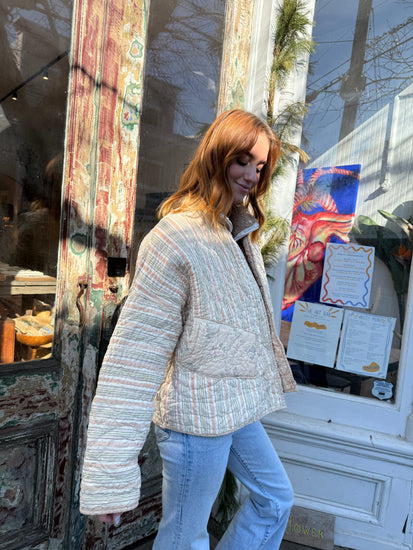 This is a one-of-a-kind handmade quilt jacket crafted from a repurposed cotton quilt with peach and cream lines on one side And flower details inside. Medium/heavy weight. This jackets fits a size medium/large (or oversize on size small) and features 2 pockets in the front. No buttons.