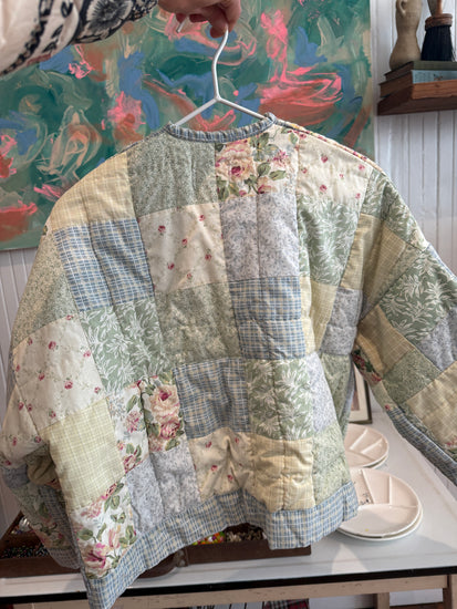 This is a one-of-a-kind handmade quilt jacket crafted from a repurposed cotton quilt with soft green, yellos, blie  details. Inside is a light blue flower pattern. Medium weight. This jackets fits a size small/extra small ) no pockets.  No buttons.