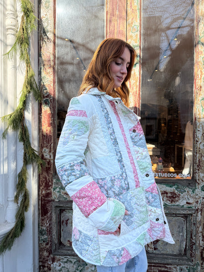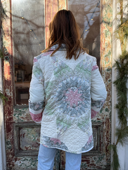 This is a one-of-a-kind handmade quilt jacket crafted from a repurposed cotton quilt with faded pink, white and grey details. Medium weight. This jackets fits a size small/medium. with  pockets in the front. And snap buttons.